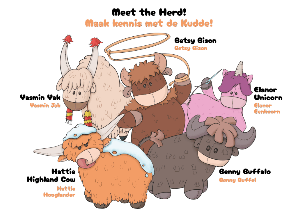 De vijf knuffels in Knuffel Buffel zijn allemaal wollige unieke karakters met hun eigen persoonlijke verhaal. Maak kennis met Betsy Bizon, Yasmin Jak, Hattie Hooglander, Benny Buffel en Elanor Eenhoorn!